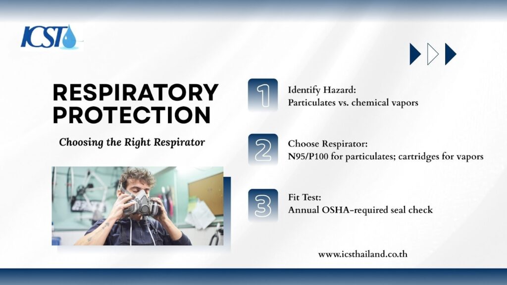 - Respirator Types: Use N95 or P100 masks for particulates and biological aerosols; use cartridge respirators for chemical vapors.