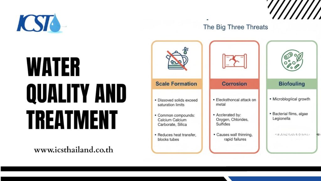 Cooling water systems face three primary failure mechanisms that can rapidly destroy equipment and halt operations. Understanding these threats guides treatment program design and monitoring strategies.
