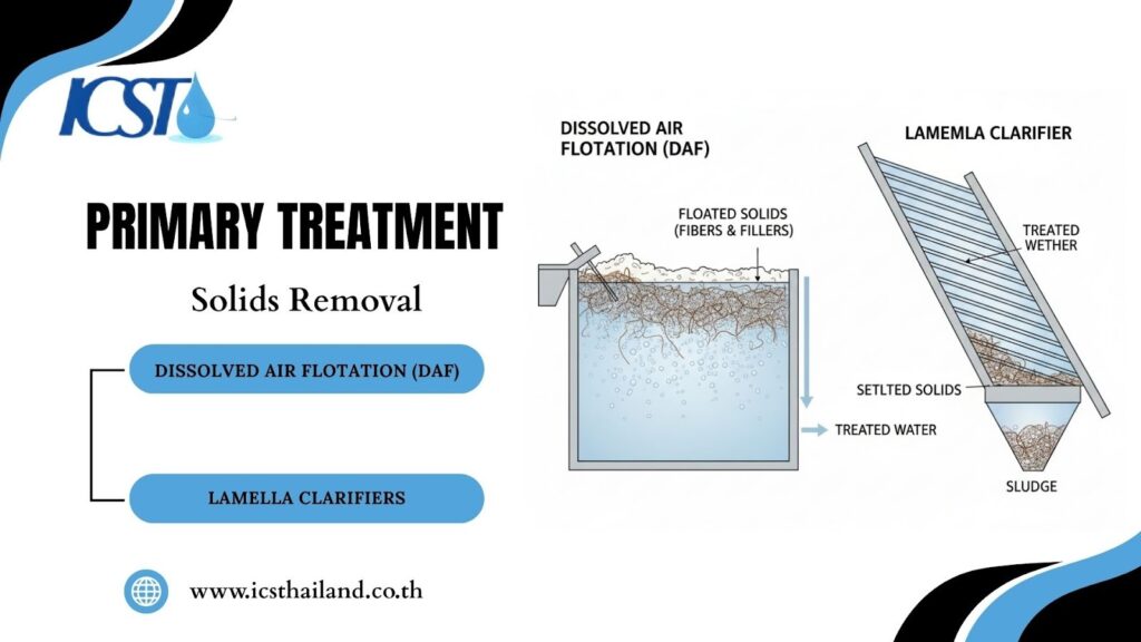 - Technology: The most effective technologies for this stage are Dissolved Air Flotation (DAF) and Lamella Clarifiers.